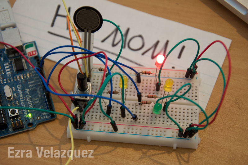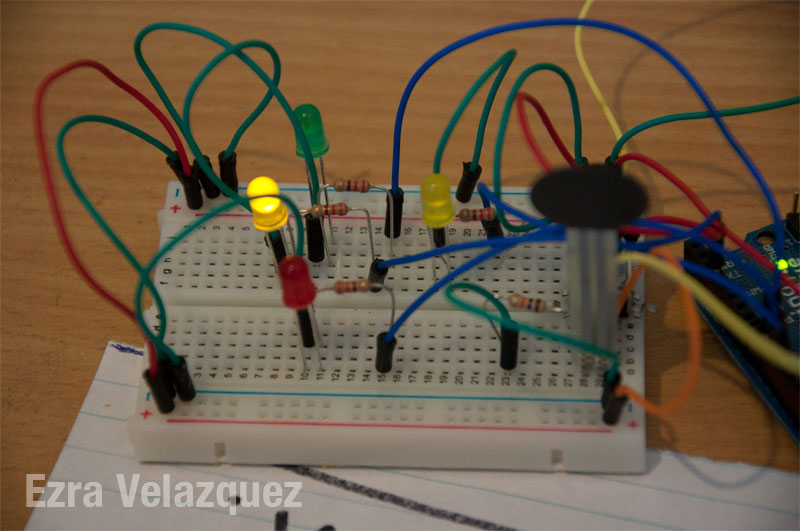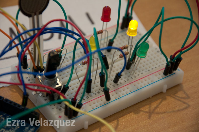 The original code allowed the turning knob to change the brightness of one LED and for the pressure gauge to change the brightness of one LED. Having a CS background, I wanted to tinker with the code. I made the turning knob to change the brightness of three LED’s. As the knob turned from left to right, the left LED would get dimmer while the center LED would get brighter. As the knob kept going right, the left LED would completely turn off, while the center LED would start to dim and the right LED would get brighter. The same action applied turning the knob right to left.